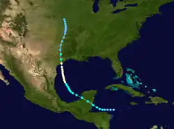 A westward-moving disturbance developed into a tropical depression over the western Caribbean Sea on June 16. About 24 hours later, the depression intensified into a tropical storm. Late on June 17, the storm made landfall in northern Belize with winds of 50 mph (80 km/h). The cyclone moved northwestward and weakened slightly while crossing the Yucatán Peninsula, but remained a tropical storm.[3] Early on June 18, the system emerged into the Gulf of Mexico and began to curve north-northwestward. Continuing to intensify, it attained hurricane status around 12:00 UTC on June 20. The hurricane drifted and strengthened further. Early on June 22, sustained winds associated with the storm peaked at 90 mph (140 km/h). At approximately 18:00 UTC, the cyclone made landfall near Matagorda, Texas, at the same intensity.[3] A ship offshore observed a barometric pressure of 980 mbar (29 inHg), which would be the lowest in relation to the storm.[4] The hurricane quickly fell to tropical storm intensity, and then weakened to a tropical depression around 12:00 UTC on June 23. However, the depression persisted for a few more days, until dissipating over northern Missouri on June 26.[3]