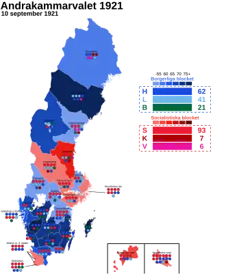 Early general elections were held in Sweden between 10 and 26 September 1921,[1] the first in Sweden under universal suffrage. The Swedish Social Democratic Party remained the largest party, winning 93 of the 230 seats in the Andra kammaren of the Riksdag. Party leader Hjalmar Branting formed his second government.