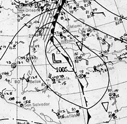 Historical weather maps suggest that a tropical depression developed about 85 mi (135 km) north-northwest of Barranquilla, Colombia, early on October 11. The depression moved slowly westward and then northwestward without significant intensification for a few days. By October 15, the depression had reached tropical storm status. Late on October 16, the cyclone began intensifying at a quicker pace, becoming the equivalent of a modern-day Category 2 hurricane on October 17. Around 00:00 UTC the next day, it peaked with maximum sustained winds of 110 mph (180 km/h).[6] Early on October 18, a ship reported a minimum pressure of 984 mbar (29.1 inHg) near the center, the lowest pressure measured during the life span of the storm.[3]