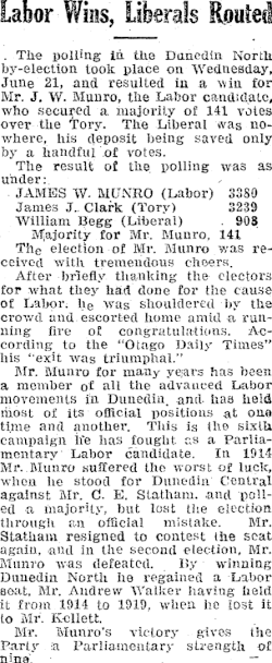 - ^ "Dunedin North By-Election: Labor Wins, Liberals Routed". Maoriland Worker. Vol. 12, no. 279. 28 June 1922. p. 5. Retrieved 11 June 2012.