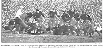 The Tigers had scored a single touchdown in the second quarter, and also the extra point for a total of seven; they then scored two additional touchdowns for 14 points in the final quarter to win the game, while holding Chicago scoreless.[9] With 12 minutes to play and Chicago nursing an 18–7 lead, Howdy Gray of Princeton picked up a Jimmy Pyott fumble and ran it 40 yards for the touchdown. Gray's father, the president of the Union Pacific Railroad, reacted by waving his program in the air, striking a woman in the shoulder.[6][10] After an additional Princeton touchdown was scored, Chicago responded with a fierce drive ending in a goal line stand with Thomas falling short of the goal.[1][11][12][13] Halfback Harry "Maud" Crum scored Princeton's other touchdowns.[14]