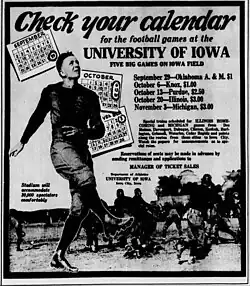 - ^ Sec Taylor (October 21, 1923). "Illinois Beats Iowa, 9 to 6: Grange Plays Havoc During Final Period". The Des Moines Register. p. Sports 1, 4 – via Newspapers.com.