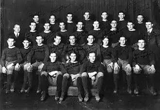 The 1924 Notre Dame Fighting Irish football team was an American football team that represented the University of Notre Dame as an independent during the 1924 college football season. In their seventh season under head coach Knute Rockne, the Fighting Irish compiled a perfect 10–0 record, defeated Stanford in the 1925 Rose Bowl, and outscored opponents by a total of 285 to 54.[1] The team was led by the legendary backfield known as the "Four Horsemen" consisting of quarterback Harry Stuhldreher, halfbacks Don Miller and Jim Crowley, and fullback Elmer Layden.