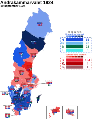 General elections were held in Sweden between 19 and 21 September 1924.[1] The Swedish Social Democratic Party remained the largest party, winning 104 of the 230 seats in the Second Chamber of the Riksdag.[2]