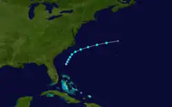 The first indications of a tropical cyclone developing were on August 17. A ship in the vicinity of the developing system reported winds of 40 mph (64 km/h) over 78 °F (26 °C) waters.[5] Around 0000 UTC the next day, the system was classified as a modern-day tropical depression with sustained winds estimated at 30 mph (48 km/h). Roughly 18 hours later, the depression strengthened into a tropical storm, the first of the season while located to the north-northeast of the Bahamas. Gradual intensification took place throughout most of the storm's life[6] as it traveled towards the northeast[7] until becoming a hurricane around 0600 UTC on August 20.[6] About 30 minutes later, a ship recorded winds of 45 mph (72 km/h)[5] and a pressure of 993.6 mbar (hPa),[2] the lowest pressure recorded in relation to the small storm.[2][5] Shortly after, the storm reached its peak intensity with winds of 80 mph (130 km/h).[6] Increasing in forward motion, the storm became extratropical early on August 21 after turning towards the north.[6][7]