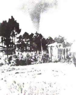 The tornado then headed north 3⁄4 mi (1.2 km), ripping up trees and demolishing six or more homes. It "literally picked up" a house, carried it 300 ft (91 m) over a road, and left it "a mass of kindling wood", the Herald reported. Another house lost its combination roof and garage.[4] A barn and house were swept off their foundations and tossed 1⁄4 mi (0.40 km).[6] At Elizabeth Park the tornado tore apart 10 homes, leaving homesites bare, and killed hundreds of chickens. It destroyed 12 more homes at Hillside Acres.[7][4] As it crossed northwestern Miami, thousands of sightseers watched the tornado. The twister then briefly lifted before reforming near the Little River,[4] where it struck several homes, leveling a large vacant frame house.[6] A few people died at the West Wood Inn, near the river.[9] Meteorologist Richard Gray, writing in the Monthly Weather Review, remarked that at this point the tornado resembled a "very slender cone extending in a straight line" from cloud to ground.[5]