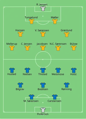 IK Aalborg Chang and Horsens FS (reserves) finished last in their respective groups and hence had to contest in play-off matches for their spots in the 1927–28 JBUs Mesterskabsrække. Kolding BK qualified to the play-offs by winning their JBUs A-række south group final match on 22 May 1927 against Vejen SF with 2–0, while Randers SK Chang secured a victory against Ry BK in their JBUs A-række north group final match.[31] Randers SK Chang's line-up for the match was composed of Pind (goalkeeper) – Heron Sørensen, Evald Larsen (defenders) – Carl Emil Sørensen, Valdemar Hansen, Kaj Christensen (midfielders) – Petrus Milwertz, C. Holting, Keill, H. Broberg and Willy Hansen (forwards).[32] IK Aalborg Chang's line-up consisted of Erik Bratten (goalkeeper) – Ingvald Petersen, captain Tom Nielsen (defenders) – Ejner Thomsen, Oscar Jensen, Aage Larsen (midfielders) – Jens Anker Arentoft, Fritz Jensen, Kaj "Mester" Eriksen, Baldus Buus and K. E. Christiansen (forwards), which was different from the team's main line-up due to sick leaves.[32][33][34] Horsens fS reserves's reinforced line-up featured Jerichau (goalkeeper) – Kaj Kleine, Emborg (defenders) - Hartvig Petersen, Herluf Petersen, Mar. Hansen (midfielders) – Viggo Mellerup, Sigvald Sørensen, Børge Beck, Victor Hansen and Henry Jacobsen (forwards).[35] The team of Kolding BK included P. Wergeltoft (goalkeeper), Emil Hansen, Skøtt, Knudsen, Ravn, Arne Hansen, "Smeden" and Jeppesen in their squad.[36]