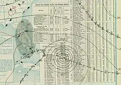 Due to the sparseness of available observations in the central Atlantic, the specific origins of the 1926 Miami hurricane remain unclear.[6] Operationally, the United States Weather Bureau in Washington, D.C., did not begin issuing advisories on the cyclone until September 14.[7] However, the cyclone is first listed in HURDAT—the official Atlantic hurricane database—as having begun as a tropical storm with maximum sustained winds of 65 mph (105 km/h) roughly 1,100 mi (1,800 km) east of the island of Martinique in the Lesser Antilles on September 11. Tracking west-northwestward, the storm gradually intensified and reached hurricane intensity on September 12 while still east of the Lesser Antilles.[8] The observation of low barometric pressures and winds suggesting cyclonic rotation at Saint Kitts on the evening of September 14 was the first to suggest that a hurricane had developed.[7] The following day, the steamship Matura encountered the strengthening tropical cyclone and documented a minimum pressure of 28.82 inHg (976 mb).[6] By 06:00 UTC on September 15, the storm had strengthened further to major hurricane intensity north of the Virgin Islands.[8]