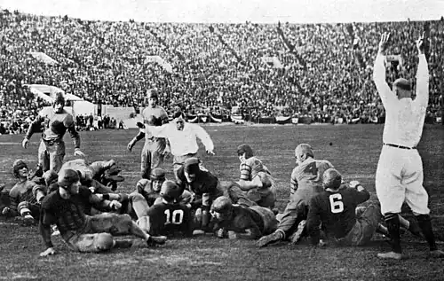 The game made its radio broadcast debut, with Charles Paddock, a sports writer and former Olympian track star, at the microphone.[3] Coach Wade was later inducted into the Rose Bowl Hall of Fame in 1990.[4]