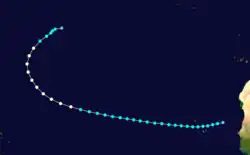 A low pressure area developed into a tropical storm about 835 mi (1,345 km) east-northeast of Barbuda early on September 23.[4][5] The system moved northwest, and by 12:00 UTC on September 24, it strengthened into a Category 1 hurricane. Late on September 25, the cyclone intensified into a Category 2 hurricane. A ship recorded a pressure of 971 mbar (28.7 inHg) on September 26. Because this was measured within the storm's radius of maximum sustained winds, the hurricane's minimum barometric pressure was estimated to have been 967 mbar (28.6 inHg). Based on the pressure-wind relationship, the system peaked with maximum sustained winds of 110 mph (175 km/h). Thereafter, it curved northeastward on September 27, shortly before weakening to a Category 1 hurricane. Early on September 28, the hurricane became extratropical about 360 mi (580 km) south-southeast of Sable Island. However, the extratropical storm existed until October 1, when it dissipated well north of the Azores.[5]