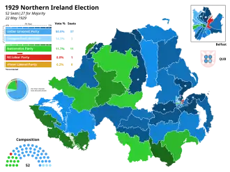 The 1929 Northern Ireland general election was held on 22 May 1929. Like all previous elections to the Parliament of Northern Ireland, it produced a large majority for the Ulster Unionist Party. It was the first held after the abolition of proportional representation and the redrawing of electoral boundaries to create single-seat constituencies. Though it had been argued this was done with the intent of gerrymandering, this has been considered unlikely as the Unionists already had a solid majority at the parliamentary level.[1] However, the opposite was more accurate at local level.[2] As with the rest of the United Kingdom, this has made it more difficult for independent and minor party candidates like the Northern Ireland Labour Party to win seats, as was the intent of the abolition of proportional representation was for the UUP to control the Unionist vote.[2]