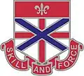 The unit insignia is a Silver color metal and enamel device 1+1⁄8 inches (2.9 cm) in height, consisting of a shield emblazoned with an argent, a cross Gules, overall a saltire Azure, that portion of the saltire upon the cross fimbriated of the field; on a chief of the second, a fleur-de-lis of the first. Attached below the shield is a red scroll inscribed "Skill and Force" in Silver letters.