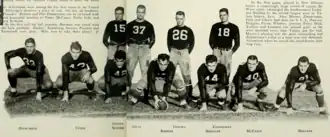 On the line, the team consisted of veterans such as ends Dalrymple and Jack Holland, center Roberts and guard Maury Bodenger, and the only newcomer John Scafide.[13][20] Both Glover and Scafide prepared at Saint Stanislaus College by playing for the "Rock-a-chaws".[20][a]