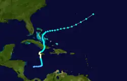 After crossing Venezuela into the eastern Caribbean, the hurricane moved northwestward and gradually intensified. On July 3 it struck western Cuba with winds of 100 mph (160 km/h).[11] In the country, the storm killed 22 people, while damage amounted to $4 million.[15] A building high pressure area turned the hurricane westward in the Gulf of Mexico,[10] and after further strengthening the storm attained peak winds of 110 mph (180 km/h) on July 5. It turned to the west-southwest and made landfall in northeastern Mexico on July 7 with winds of 100 mph (160 km/h), about halfway between Tampico and the Mexico/United States border. It dissipated about 11 hours later over Mexico.[11] There were several deaths and heavy damage in the area where the storm moved ashore.[10] Across its path, the hurricane killed 35 people.[16]
