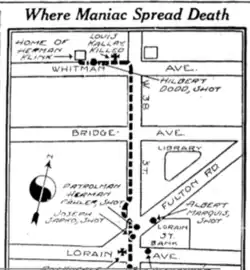 After arming himself with a .22-caliber rifle, Klink walked out of his Whitman Avenue home and shot a man in the shoulder. The man managed to survive after running for cover behind a tree. Klink then shot 52-year-old Louis Kallay, who had walked out of his house to investigate the gunshot he heard.[3] He also fatally shot 43-year-old Roy Kneale.[5] Klink proceeded on foot to West 38th street, where he mortally wounded Herman Pahler, a patrolman directing traffic in front of St. Mary's Catholic School, after shooting him in the abdomen, groin, and legs. As Albert Marquis, 67, and Joseph Sapko, 22, ran for cover in opposite directions, Klink shot them both in their abdomens. Pahler, Marquis, and Sapko died from their injuries in the hospital days after the shooting.[6] Klink continued to shoot at people who tried to help the other victims.[7]