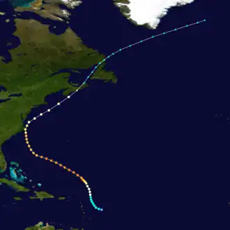 Beginning on September 7, there was an area of disturbed weather near and east of the Lesser Antilles,[3] by which time there was a nearly closed circulation. At 0800 UTC the next day, a ship reported winds of about 35 mph (56 km/h); on that basis, it is estimated a tropical depression developed eight hours earlier and into a tropical storm by the time of the report. The storm tracked generally to the north-northwest,[4] passing about 300 mi (480 km) northeast of Saint Martin. Based on continuity and subsequent reports, it is estimated the storm intensified into a hurricane on September 10. Early on September 12, a ship reported a barometric pressure of 947 mbar (28.0 inHg) in the periphery of the storm while reporting winds of 70 mph (110 km/h). This suggested winds of 140 mph (230 km/h), making it the equivalent of a modern Category 4 hurricane on the Saffir-Simpson scale.[4]