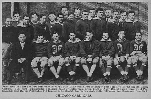 The 1934 Chicago Cardinals season was their 15th in the National Football League. The team improved on its previous output of 1–9–1, winning five games,[1] but failing to qualify for the playoffs for the ninth consecutive season. Despite shutting out five opponents, the Cardinals were themselves shutout four times; nine of their eleven games left one team scoreless. The Cardinals had only 302 yards passing the entire season, which remains an NFL record.