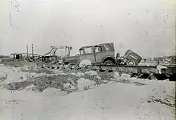 The hurricane produced squalls and sustained winds up to 45 mph (72 km/h) on Key West, causing little damage.[27] Similarly, mostly minor impacts occurred on Big Pine and No Name keys, aside from winds blowing away tar paper roofs and ripping window screens. In Marathon, the hurricane demolished a large fish house on Boot Key. Many dwellings lost their roofs, while some others were destroyed. A school building also suffered damage to its roof and some doors and windows, while a Florida East Coast Railway dredge was swept about three blocks inland. One fisherman in Marathon died. Significant damage occurred to a fish house on Key Vaca, where water reached up to 8 ft (2.4 m) above ground, causing the death of one person. Extensive washouts to the railway and roads were reported on Crawl and Grassy keys. Waves swept away four people on the latter. Additionally, a report by the Florida Emergency Relief Administration noted that "the only thing standing on this key is one-half of the white foreman's house."[28] In the Upper Florida Keys, the hurricane left a path of near-total destruction, centered on what is today the village of Islamorada,[29] although the hurricane's destructive path was narrower than most tropical cyclones.[30] Its eye was 8 mi (13 km) across and the fiercest winds extended 20 mi (32 km) off the center,[29] similar to 1992's Hurricane Andrew, which was also a relatively small and catastrophic Category 5 hurricane.[30] The Florida section of Climatological Data stated that the Upper Florida Keys experienced winds from 150 to 200 mph (240 to 320 km/h), while gusts probably went above 200 mph (320 km/h). Tides reached high enough to wash away crossties and railroad tracks of the Florida East Coast Railway, which had viaducts that were 30 ft (9.1 m) above the average water level.[23] Additionally, storm surge ranged from 18 to 20 ft (5.5 to 6.1 m) in height.[31]