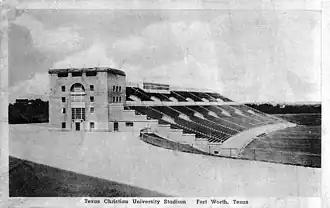 - ^ Sources vary considerably regarding the overall attendance for the game. On the low end, a 2021 article on TCU 360 stated that the game had 36,000 attendees, with Amon G. Carter Stadium only having a seating capacity of 30,000 at the time.[14] In a 2017 book, historian Bill O'Neal gives a slightly different number for the seating capacity, stating that the stadium had a regular capacity of 24,000 and that temporary bleachers were brought in to add 3,500 extra seats.[41] O'Neal also cites contemporary sportswriter Grantland Rice as estimating that about 37,000 people were in attendance.[41] Contemporary reporting from the United Press gave the stadium an estimated capacity of about 32,000 and stated that an estimated 18,000 were expected to be turned away at the gates.[12][24] A 2010 article on ESPN.com stated that the stadium had a seating capacity of about 25,000, but held 37,000 for the game, with many spectators sitting behind endzones or in nontraditional seating arrangements.[8] The 1936 SMU yearbook stated that there were over 37,000 attendees.[42] A 2010 book by historians Fred Eisenhammer and Eric B. Sondheimer stated that over 40,000 people were in attendance,[19] while a 2004 article by The Daily Campus stated that 42,000 people attended, despite a seating capacity of about 30,000.[21]