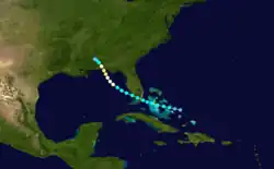 On June 9, a tropical cyclone with atmospheric pressure below 988 mb (29.18 inHg) made landfall on the Pacific coast of Guatemala.[4] It moved northeastward across Central America, but dissipated before reaching the western Caribbean Sea on June 12. The storm quickly re-organized, and again developed into a tropical storm on June 12. It moved north-northeastward, resulting in light winds as it paralleled the eastern coasts of Belize and the Yucatán Peninsula. After reaching the Gulf of Mexico with peak winds of 45 mph (75 km/h), the storm turned to the northeast, then to the east. On June 15, the tropical storm made landfall about 20 mi (32 km) to the south of Fort Myers, Florida, and after crossing the state it passed over Miami before entering the Atlantic Ocean.[4] It weakened as it accelerated northeastward through the Bahamas, and on June 17 the system dissipated to the north of Bermuda.[1]