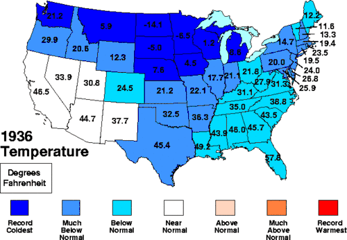 - ^ "Climatological Rankings, January 1936, Average Temperature, North Dakota". National Centers for Environmental Information. Retrieved May 2, 2021.