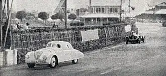 It was at the end of the first hour that the accident occurred. The Maison Blanche corners, leading up to the pit-straight, already had a notorious reputation with serious multi-car accidents in the 1927 and 1932 races. Running a lap down, René Kippeurt lost control of his Bugatti coming through the left-right combination at 130 kp/h (80 mph). Hitting the bank hard and mowing down a length of fencing, the car got airborne throwing the driver out onto the circuit before rolling several times down the road.[33][8][35] Next to arrive were the two BMWs of Roth and Fairfield. Instinctively Roth swerved right, sending him over a ditch, through a hedge and rolling his car. Unsighted, Fairfield went the other way but slammed into the Bugatti head-on.[36][35] The impact was so hard, it dislodged the engine off the Bugatti's chassis. Next to arrive was Trémoulet in his Delahaye, but he could do nothing but hit the stationary Frazer Nash-BMW, and go flying through the air and ending up in a field. The Talbot of "Raph" hit Trémoulet and ricocheted into a roadside tree. The chain reaction continued when the Riley of Forestier, in turn, rear-ended the Talbot and ending up through a hedge. Morris-Goodall, in his Aston-Martin, skidded on spilt oil and side-swiped the Bugatti while Chiron, running again, was able to slide to a stop and squeeze his Talbot through.[33][25][32][31][35] However, running over debris, a sliver slashed a water hose and he lost his coolant forcing his retirement as well.[12]