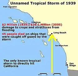The 1939 California tropical storm, also known as the 1939 Long Beach tropical storm, and El Cordonazo (referring to the Cordonazo winds or the "Lash of St. Francis" (Spanish: el cordonazo de San Francisco)), was a tropical cyclone that affected Southern California in September 1939. Formerly classified a hurricane,[1] it was the first tropical cyclone to directly affect California since the 1858 San Diego hurricane,[2] and is the only tropical cyclone of tropical-storm strength (or greater) to make landfall in the U.S. state of California.[3] The storm caused heavy flooding, leaving many dead, mostly at sea.[1]
