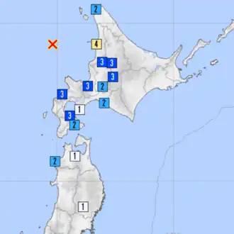 Damage caused by seismic shaking was light;[12] the reported JMA seismic intensities were Shindo 4 at Haboro and Shindo 3 at Sapporo, Morimachi, Suttsu, Ishikari-Numata, Asahikawa, and Furano. Shaking was felt across all of western Hokkaido and parts of Russia. Weak shaking was observed at Muroran, Aomori, Mizusawa in Iwate Prefecture and Tsukubsan, Ibaraki Prefecture.[13]