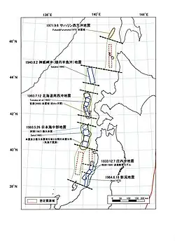 - ^ a b c Murotani, S.; Satake, K.; Ishibe, T.; Harada, T. (12 April 2022). "Reexamination of tsunami source models for the twentieth century earthquakes off Hokkaido and Tohoku along the eastern margin of the Sea of Japan". Earth, Planets and Space. 74 (52). doi:10.1186/s40623-022-01607-4. S2CID 244598008.