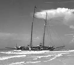 In the Bahamas, where considerable property damage was reported, the storm killed three people.[2] Winds in Nassau reached 104 mph (167 km/h).[17] City streets were filled with debris, including a schooner, four sloops, and numerous other boats deposited by the winds on Nassau's Bay Street.[18][19] The winds knocked down trees and power lines, resulting in fires and extensive power outages.[20] Along the coast, boats were ripped from their moorings and smashed against seawalls.[10] No casualties occurred in the city. A schooner, the Goodwill II, sank during the storm. Properties and gardens received significant damage.[2] On Cat Island, the storm produced 1.62 inches (40 mm) of rainfall.[17]