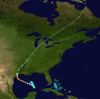 In the middle of September, disturbed atmospheric conditions from a trough or tropical wave existed over the western Caribbean Sea and gradually coalesced near western Cuba on September 15–16. Even so, surrounding surface weather observations did not suggest that an area of low pressure had generated, but gradual organization continued until a tropical depression formed on September 17 in the central Gulf of Mexico about 120 miles (193 km) north of the Yucatán Peninsula.[1] Operationally, the United States Weather Bureau failed to detect a tropical cyclone in the Gulf of Mexico until a day later.[2] After formation, the system initially moved northwestward, a heading that continued early on September 18. At that time, the system became a tropical storm more than 300 mi (483 km) to the south-southeast of New Orleans, Louisiana.[3]
