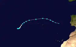 On the second week of October, a broad area of low pressure began to take shape along a frontal boundary across the northeastern Atlantic. The system steadily acquired tropical characteristics,[10] and it was designated as a tropical storm by 00:00 UTC on October 11 while located about 570 mi (920 km) west-southwest of the Azores. It moved very slowly east and then northeast, attaining hurricane intensity and peaking with winds of 80 mph (130 km/h) on October 12. The cyclone resumed its eastward motion shortly thereafter and weakened below hurricane strength, passing north of the Azores before transitioning into an extratropical cyclone early on October 15.[2] The post-tropical storm tracked east-southeast into Portugal and Spain, where a sustained wind speed of 46 mph (74 km/h) was recorded in Seville.[10]