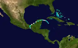 A tropical wave led to the formation of another tropical storm over the northwestern Caribbean Sea around 06:00 UTC on September 19.[6] It moved northwest after formation while steadily intensifying, attaining hurricane strength by 00:00 UTC the next day. The storm moved ashore near Cancún, Quintana Roo, with winds of 80 mph (130 km/h). After moving inland, the cyclone weakened to a tropical storm and curved southwestward. After emerging into the Bay of Campeche early on September 21, it re-attained peak winds of 80 mph (130 km/h) and made a second landfall near Paraíso, Tabasco. The cyclone turned south over the mountainous terrain of Mexico,[10] dissipating after 12:00 UTC on September 22.[2]