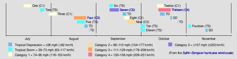 | Seven | September 9 – 15 | Category 5 hurricane | 160 (260) | 918 | North Carolina, Mid-Atlantic region, New England, Atlantic Canada | $100 million[7] | 391[7][8] | |||