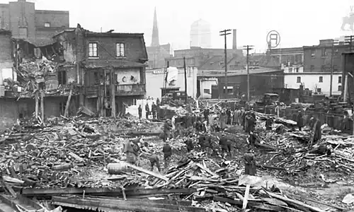 On April 25, 1944, a Royal Air Force Liberator B Mark VI en route to Britain via Gander, Newfoundland crashed into the Griffintown neighborhood in downtown Montreal, Quebec minutes after taking off from Dorval Airport. The five-member crew and ten civilians on the ground were killed, and a large fire destroyed at least 10 homes.[1]