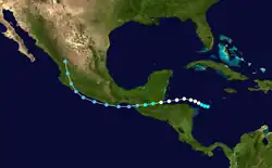 Early on October 2, the tenth tropical storm of the season was noted about 150 mi (240 km) northeast of the Nicaragua–Honduras border. It intensified into a Category 1 hurricane by 00:00 UTC the next day on a general west-northwest track and peaked with winds of 90 mph (140 km/h) 24 hours later,[2] although the crew aboard a reconnaissance aircraft originally estimated 100 mph (160 km/h) sustained winds.[3] The cyclone tracked west-southwest and made landfall north of Punta Gorda, Belize at peak strength, quickly weakening once inland. Crossing Guatemala and Chiapas, the depression paralleled the coastline of Mexico for a time before moving ashore west of Lázaro Cárdenas, Michoacán. The wilting system dissipated over southern Durango by 12:00 UTC on October 7.[2]