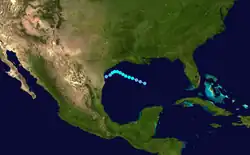 A tropical storm formed southeast of the Nicaragua–Honduras border early on August 29 and tracked northeast. After curving north and then west, the cyclone attained peak winds of 70 mph (110 km/h) over the Gulf of Honduras early on August 31. It moved ashore near Belize City, Belize at peak strength, where heavy rainfall and high tides resulted in flooding of 2–3 ft (0.61–0.91 m) within the city.[3] The system weakened quickly once inland, dissipating just northeast of Ocosingo, Chiapas by 18:00 UTC on September 1.[2]
