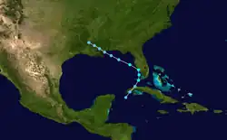 On the heels of Tropical Storm Six, a new tropical depression formed over the western Caribbean Sea by 18:00 UTC on September 3. The fledgling cyclone moved northeast and crossed the western coastline of Cuba near Punta de Cartas before emerging into the Straits of Florida early on September 4. The depression intensified into a tropical storm and attained peak winds of 40 mph (64 km/h), maintaining such strength as it moved ashore near Sanibel, Florida by 00:00 UTC on September 5. It turned abruptly northwest into the northern Gulf of Mexico and weakened to a tropical depression before making a second landfall along the coastline of Mississippi. The weak depression dissipated about 45 mi (72 km) south-southeast of Monroe, Louisiana around 18:00 UTC on September 6.[2] A testament to the weak nature of the storm, only scattered squally weather affected southern Florida, amounting to minor damage to boats in Miami harbors.[3]