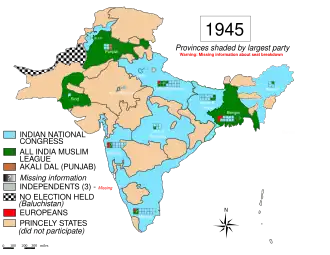 General elections were held in British India in December 1945 to elect members of the Central Legislative Assembly and the Council of State.[2] The Indian National Congress emerged as the largest party, winning 57 of the 102 elected seats.[3] The Muslim League won all Muslim constituencies, but failed to win any other seats. Of the 13 remaining seats, 8 went to Europeans, 3 to independents, and 2 to Akali candidates in the Sikh constituencies of Punjab.[4] This election coupled with the provincial one in 1946 proved to be a strategic victory for Jinnah and the partitionists. Even though Congress won, the League had united the Muslim vote and as such it gained the negotiating power to seek a separate Muslim homeland as it became clear that a united India would prove highly unstable. The elected members later formed the Constituent Assembly of India.