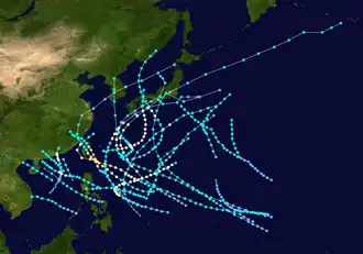 The scope of this article is limited to the Pacific Ocean, north of the equator and west of the International Date Line. Storms that form east of the date line and north of the equator are called hurricanes; see 1945 Pacific hurricane season. Predecessor agency to the Joint Typhoon Warning Center (JTWC), Fleet Weather Center/Typhoon Tracking Center was established on the island of Guam in June 1945, after multiple typhoons, including Typhoon Cobra in the previous season and Typhoon Connie in this season, had caused a significant loss of men and ships.[1][2] It would not take major responsibility in the West Pacific basin until 1950 season.[1] Instead, storms in this season are identified and named by the United States Armed Services, and these names are taken from the list that USAS publicly adopted before this season had started earlier this year.[3][4] Since this is the first season to be included in the West Pacific typhoon database, this would also be the first season where the names of Western Pacific tropical cyclones are preserved publicly.