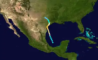Towards the end of August 1945, an area of squally weather persisted in the Bay of Campeche, near the Gulf Coast of Mexico. After a prolonged period of marginal development, the cluster of thunderstorms began to quickly organize beginning on August 24.[2] According to HURDAT – the official database listing positions and intensities of Atlantic tropical cyclones dating back to 1851 – the disturbance became sufficiently organized to be classified as a tropical storm by 0000 UTC on August 24. At the time, the storm already maintained maximum sustained winds of 45 mph (72 km/h). Initially, the tropical storm moved generally northward at approximately 18 mph (29 km/h), but gradually slowed as it neared the United States Gulf Coast. Quickly developing past tropical cyclogenesis, the system reached the equivalent of a modern-day Category 1 hurricane at 0600 UTC on August 25.[3] Its forward motion continued to slow until it moved nearly stationary at roughly 5 mph (8.0 km/h), which allowed the system to remain a tropical cyclone for an extended period of time, despite its proximity to the coast.[2] The hurricane's intensity continued to quickly increase, and by 1200 UTC on August 26, the storm had attained major hurricane status, the equivalent of a modern-day Category 3 hurricane.[3]