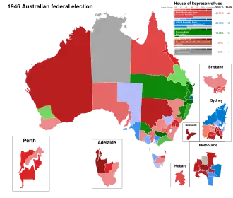 The 1946 Australian federal election was held in Australia on 28 September 1946. All 74 seats in the House of Representatives and 19 of the 36 seats in the Senate were up for election. The incumbent Labor Party led by Prime Minister Ben Chifley defeated the opposition Liberal–Country coalition, led by Robert Menzies. It was the Liberal Party's first federal election since its creation. This was the first time the Labor party had won a second consecutive election. This was also the last time the Labor party would win a federal election until the 1972 election.