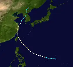 Gertrude formed on August 27 east of the Philippines. It moved west while reaching peak intensity as a Category 2 typhoon. It later weakened and re-strengthened to a Category 1 typhoon. After passing Luzon, Gertrude moved west-northwest and hit China as a tropical storm. It dissipated on September 4.
