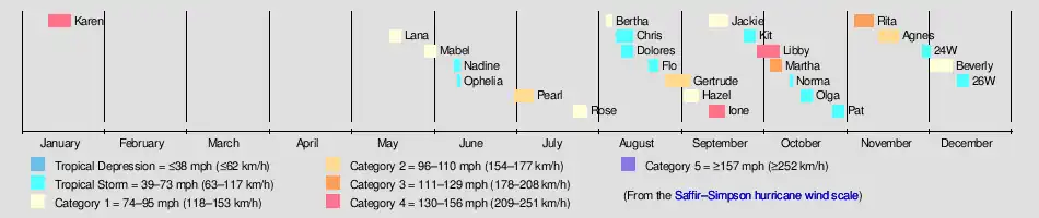 Typhoon Karen, one of the earliest recorded super typhoons, developed on January 11, well west of the Philippines. It curved westward while slowly intensifying. After a prolonged period of slow intensification, the tropical cyclone began to rapidly strengthen. It became a super typhoon on January 16. Shortly after, it weakened and dissipated on January 19.