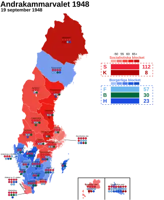 General elections were held in Sweden on 19 September 1948.[1] Despite a campaign by a large part of the Swedish press against socializing insurances, controlled foreign trade and rationing regulations still in use since the war, freshman Prime Minister and Social Democratic leader Tage Erlander managed to defeat the People's Party-led opposition under Bertil Ohlin by a higher election turnout. He maintained his government with only minor losses and the Swedish Social Democratic Party remained the largest party, winning 112 of the 230 seats in the Andra kammaren of the Riksdag.[2] Erlander was to stay on as Prime Minister until 1969.