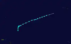 A tropical wave developed into a tropical storm east of Puerto Rico on September 3. It moved northward and strengthened to a hurricane later that day, but then weakened to a strong tropical storm the next day. At the same time, the system halted its forward motion and began to drift eastward. Early on September 5, it re-intensified into a hurricane, and it became a major hurricane on September 6. The storm turned to the north on September 7 and passed about 65 mi (105 km) east of Bermuda on September 8.[8][6] The hurricane weakened as it accelerated northeastward over cooler waters, and became extratropical on September 10 near Atlantic Canada. Shortly after becoming extratropical, it passed over Newfoundland, and ultimately dissipated on September 11 near southwestern Greenland.[8]
