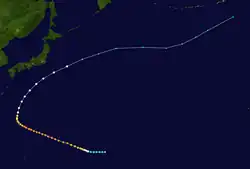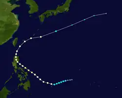 Camilla, the final significant storm of the 1949 typhoon season was the ninth tropical cyclone to intensify in the Yap-Palau area. Similar to other late season storms; Camilla moved west northwestward across the Philippines at an average speed of 12 knots. Here, Camilla departed from the climatological tracks curving northward across northern Luzon, weakening while crossing the mountainous area. Camilla then continued to move northeastward along the polar though, accelerating rapidly and becoming extratropical just east of Okinawa.[17]