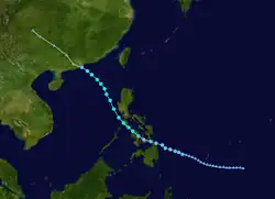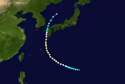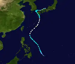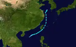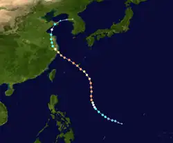 Gloria, one of the most intense and destructive typhoons of the 1949 season, formed from a vortex associated with an easterly wave which was intensified by a southwesterly monsoon surge after passing south or Guam. Gloria was first detected as a typhoon near 15 N. and 132 E. Her future track was north for 450 miles with curvature to the northwest passing over Okinawa and entering the China coast near Shanghai. Maximum winds were estimated in excess of 110 knots.[7] Gloria was the strongest typhoon to make landfall in the Shanghai area until Typhoon Bebinca 75 years later.[8][9]