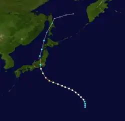 Kitty originated from an easterly wave that passed Kwajalein and intensified near 23 N and 154 E. It is believed that intensification was the result of a westerly trough that moved to the north of the storm prior to its detection. Further, the northwest movement into the nose of the Pacific high cell carried out in maintaining the gradient. Kitty began recurvature near 32 N and 140 E, but was never completed as the storm maintained a northerly movement across Honshu and dissipated near Hokkaido; reconnaissance reported a maximum wind of 65 knots. Kitty cut a wide swathe of destruction in the Tokyo area than any storm during the 1949 season; gusts of up to 75 knots were reported along with torrential rains.[11] Kitty is responsible for 135 deaths and 25 persons missing; it was one of the most destructive typhoons to hit Tokyo at that time.[12]