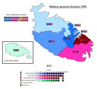 General elections were held in Malta between 2 and 4 September 1950.[1] Following the Labour Party splitting into the Malta Labour Party and the Malta Workers Party, the Nationalist Party emerged as the largest party, winning 12 of the 40 seats.